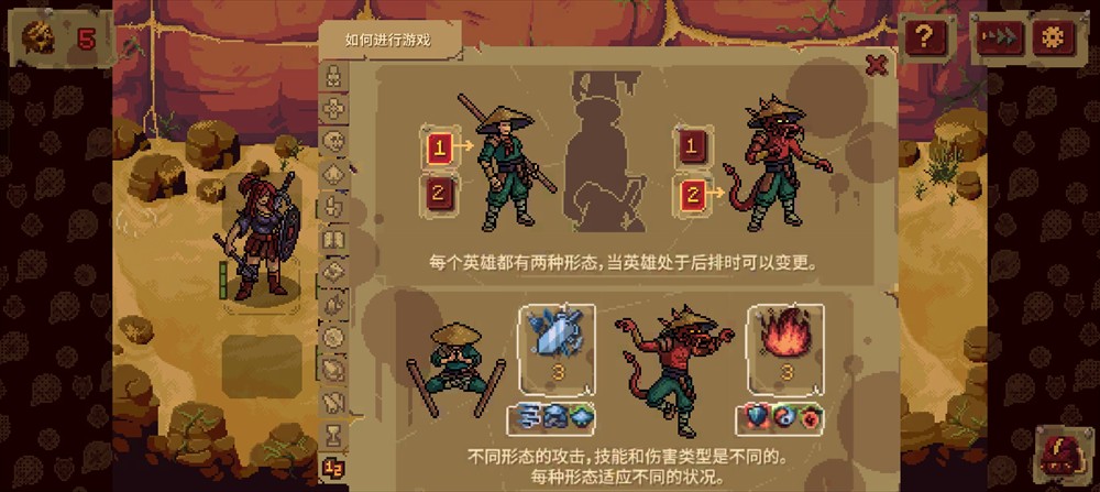3、每个英雄都有两种形态,当他处于后排位置时可以变更,不同形态下的技能和伤害类型也不同