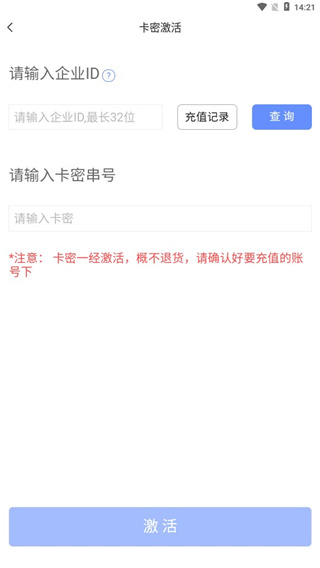 7、点击进入卡密激活,用户输入企业ID和卡密串号即可立即激活。